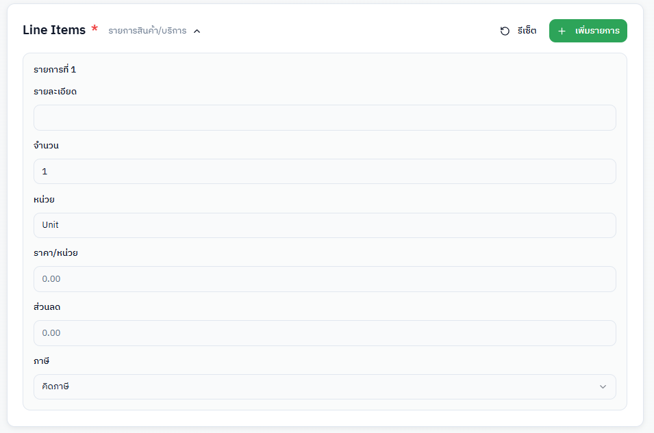 ผู้ใช้งานสามารถที่จะเพิ่มรายละเอียดต่าง ๆ ของสินค้า และบริการได้ในส่วนนี้ ทั้งจำนวน หน่วย ราคา/หน่วย ส่วนลด และสามารถเลือกที่จะยกเว้นหรือคิดภาษีของรายการสินค้าแต่ละชิ้นได้