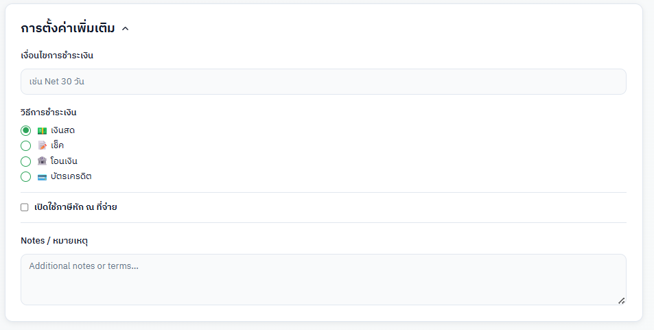 คุณสามารถจะระบุข้อมูลเพิ่มเติมของเอกสารได้ในส่วนนี้ เช่น กำหนดเงื่อนไขในการชำระเงินเป็นลายลักษณ์อักษร แจ้งวิธีการชำระเงิน หรือเปิดใช้ภาษีหัก ณ ที่จ่ายได้ ในช่องหลายเหตุก็สามารถระบุข้อมูลอื่น ๆ ได้ เช่น หมายเลขบัญชีธนาคารผู้ขาย เป็นต้น