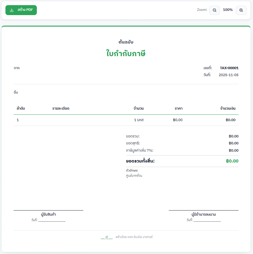 เครื่องมือสร้างใบกำกับภาษีและเอกสารทางการเงินนี้ถูกออกแบบมาเพื่อช่วยให้ผู้ประกอบการไทยสามารถสร้างเอกสารทางการเงินแบบมืออาชีพได้ง่ายๆ โดยไม่ต้องใช้โปรแกรมที่ซับซ้อนหรือจ่ายค่าบริการรายเดือน อย่างไรก็ตาม ซิมเปิล บาลานซ์แนะนำให้ตรวจสอบเอกสารก่อนและหลังดาวน์โหลดทุกครั้ง เนื่องจากเครื่องมือนี้ยังอยู่ระหว่างการพัฒนาเพิ่มเติม