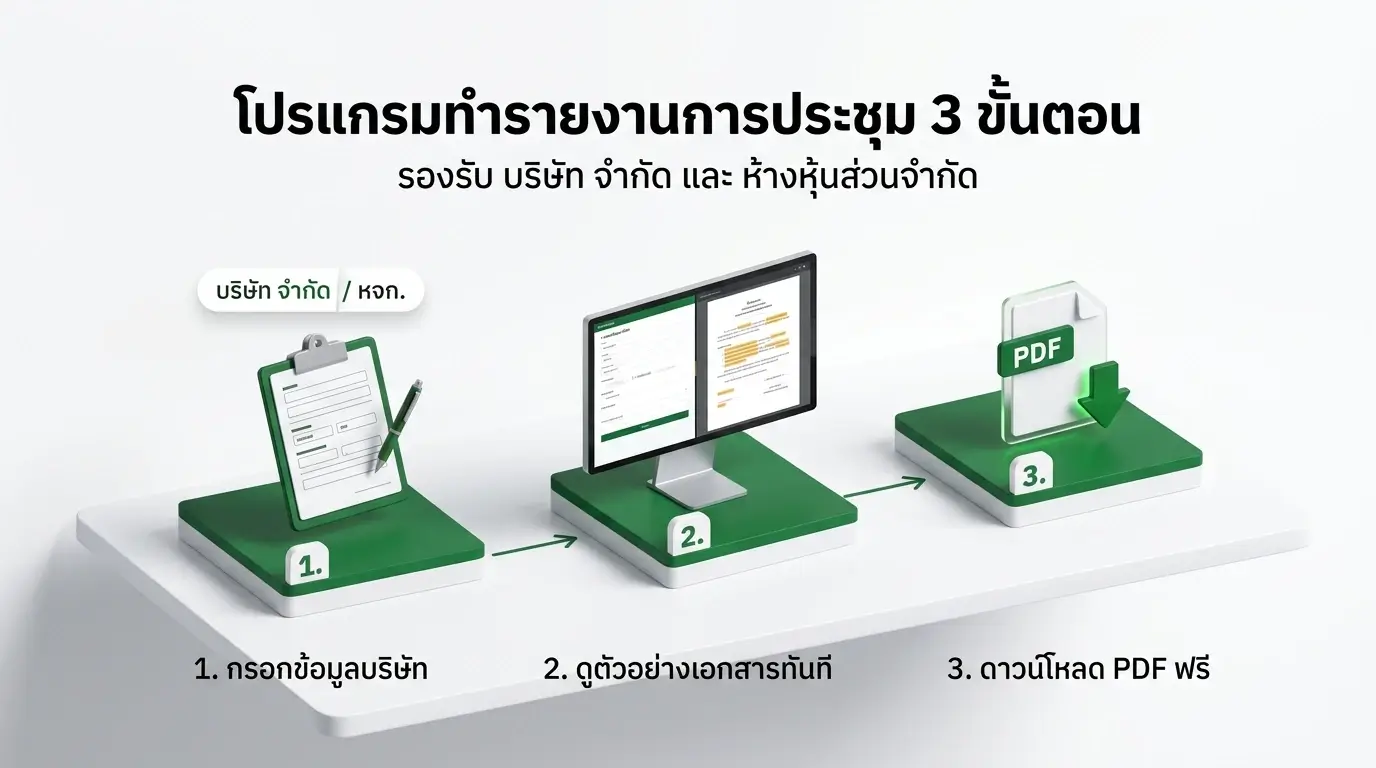 โปรแกรมทำรายงานการประชุมง่าย ๆ ใน 1 นาทีพร้อมดาวน์โหลดเป็นไฟล์ PDF พร้อมตัวอย่าง ทำได้ทุกอย่าง ไม่ว่าจะเป็นวิสามัญผู้ถือหุ้น หรือเพื่อเปิดบัญชีธนาคาร